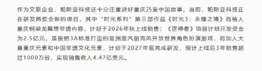 据介绍,这个项目计划投入2.5亿元开发资金,计划于2027年底完成研发。预计游戏上线后的三年里,销量能超过1000万份,实现4.47亿美元的销售收入。看来帕斯亚对这款游戏信心满满。