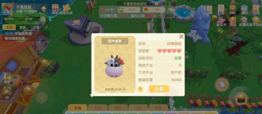 然后,把牛放进牛棚里,牛棚需要提前建造好,或者升级好,牛棚的等级,会影响牛的生活环境,环境越好,牛的心情就越好,心情好的牛,长得更快,产出的东西也更多。