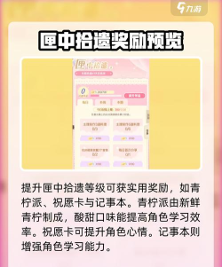 一般来说我们需要通过做任务提升匣中拾遗的等级,当你的等级满了之后,就可以不需要再做任务,并且能够领完所有的奖励。其中的奖励就包括青柠派,这是一种用新鲜青柠制作而成的食物。口感非常酸甜可口,如果给角色准备的话,就可以大幅度提升他们的学习效率。