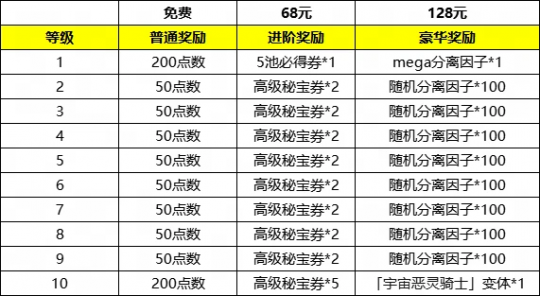 完成通行证任务提升通行证等级,解锁【星尘徽章】和【高级星空币】等奖励,若您选择购买通行证,更能解锁 Mega 分离因子、战场背景等专属奖励。