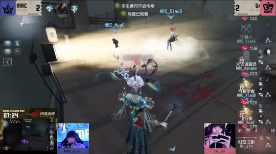 第一天,Gr vs MRC第二局下半场,地图永眠镇,Gr_Jin时空之影开局本体追击MRC_XiaoX守墓人,寄生同时伊斯人释放异族本相对守墓人进行侵蚀度叠加,守墓人果断遁地,在伊斯人干扰外围密码机的时候,利用震颤转点至红蝶亭双十一板区拉开较大身位。在侵蚀度62%时,因异族本相处于真空期,监管者只能闪现开刀,守墓人再度遁地,持续拉开身位转至独栋别墅区,Gr_Jin依次寄生气象学家和守墓人并进行陶片传送欲拉进身位,在此期间,MRC_XiaoX扭转视角,再次规避异族本相,虽然侵蚀度来到了很危险的91%,但也有了喘息余地继续进行牵制。MRC_XiaoD气象学家利用强风控制住传送落地的时空之影,但自己没能及时逃离侵蚀领域,被叠满侵蚀度后强行拉回,监管决定先从气象学家身上获取存在感,再对守墓人徐徐图之,最终在侧门封闭板区将其击倒,MRC_XiaoX优秀的牵制将场上密码机进度拖至三台半,虽然牵制时间足够,但对于求生者方来说,目前如果想运营多跑需要面对两个问题:面对时空之影此类控场能力极强的监管者,中场遗产机已然被压住;且其余求生者没有携带化险为夷,若非抗刀很难有能力带离遗产。MRC_XiaoD气象学家在中场持续加压,在MRC_HuaC飞行家救援的同时抢修密码机,MRC_HuaC成功将人救下并抗到一刀,且在92%侵蚀度的时候及时使用飞行器离开侵蚀领域避免双倒。经过一番管控遗产机与守椅的拉扯后,守墓人还是在密码机压好前被淘汰,MRC求生者进入三人开门战环节。Gr_Jin寄生破译墓地门的飞行家后收回,再前去管控另外一边的门,发觉飞行家侵蚀度上涨果断传送陶片,将飞行家的喷气背包逼出使其转点进墓地远离大门,同时伊斯人压制MRC_Nanako火灾调查员使其不敢点侧门,本体佯装深入追击MRC_XiaoD气象学家,实则将没有道具的飞行家引诱出来方便寻找突破口,但在S板区MRC_HuaC飞行家极限翻板,监管者闪现失误,虽然最终飞行家还是被击倒,但两侧的门均被拖开。挽留即将结束,MRC求生者决定继续一搏,MRC_XiaoD气象学家点开门后向飞行家所在的狂欢之椅方向深入,MRC_Nanako火灾调查员提前放置好气囊铺路并一同辅佐救人,MRC_XiaoD即使在救人过程中被异族本相打断,依然在极限的93%侵蚀度将人救下并利用气囊弹射拉开距离,避免自己在场内被眩晕击倒。在逃脱过程中,MRC_XiaoD预判监管者会寄生生成侵蚀陶片进行拦路,自己的高危侵蚀度一定会造成眩晕,便先行翻板利用板子将自己与监管者隔开避免被快速击倒,只要飞行家逃出大门,气象学家可以利用层云出门,确保为队伍保一个至少是平局”的下限。监管者急于拦人,电车启动得恰逢其会,与其相撞,气象学家有条不紊地利用层云冲向大门,快人一步避免被电车撞晕,火灾调查员则地窖逃生,MRC求生者顶住压力,成功完成开门战三人三跑!