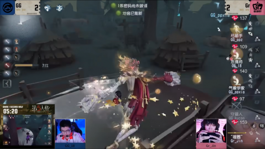 第三天,Gr vs成都GG第一局下半场,Gr_Jin喧嚣”在湖景村大船船头将守墓人淘汰后,移形去追击GG_ppz弓箭手,GG_ppz利用臂弩命中监管者后再使用飞轮规避双重惊喜的两层标记,顺利进入板区,喧嚣”空中飞人跟上距离,火速施加粘土标记,在弓箭手转入小木屋前成功拿到一刀伤害,而后再次使用双重惊喜将其击倒上挂,而后直接赶往中场守遗产机。GG_18木偶师也在此期间成功将海边密码机补开,待监管者离开后将弓箭手救下。Gr_Jin利用空中飞人快速贴近中场,远程操控分身成功对GG_ppxia气象学家附上两层惊吓标记,通过对舞台的精准把控在板间快速将其击倒,接着去将木偶师逼离中场,仅用10秒便使其状态仅剩四分之一,然后使用移形回防气象学家和弓箭手调整状态,仅用4秒再次将气象学家击倒,利用移形返程,远程释放分身精准定位木偶师,自信回头出刀附上干冰标记,与之前还没消散的惊喜标记叠加触发伤害将木偶师击倒并上挂,最后收割弓箭手,顺利拿下四抓。Gr_Jin从开局击杀守墓人,到两次守椅均成功追到双倒,再到围绕最后一台密码机的拉扯,每次出击都在电光火石间爆发,打对手一个措手不及,风格强悍得让人望而生畏。