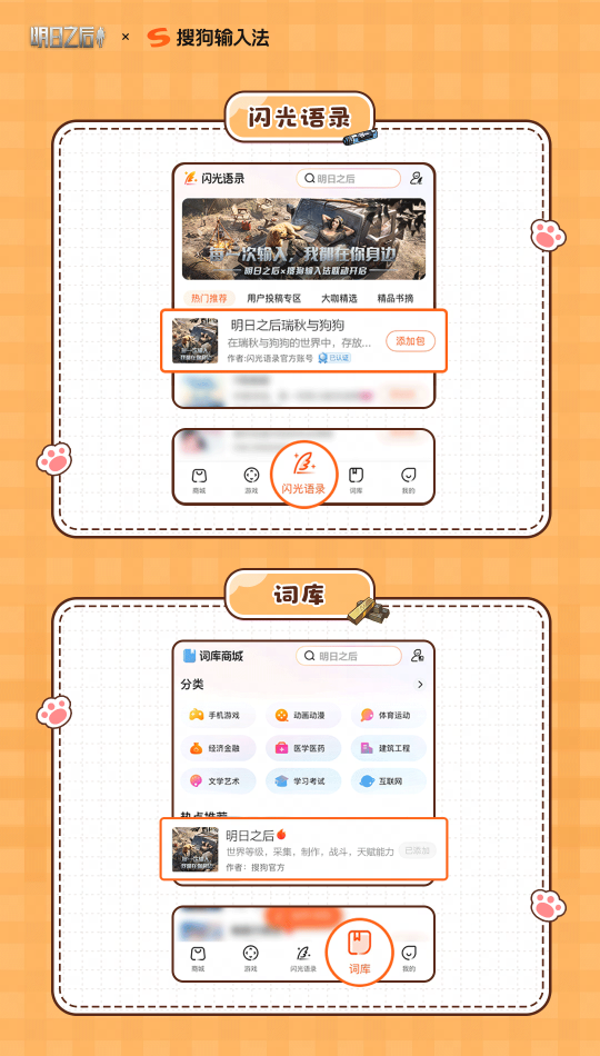 此次特别联动中,瑞秋与狗狗”表情包、闪光语录、定制聊天气泡和《明日之后》专属词库在「搜狗输入法」内同步上线,一键启用、快速表达,每一次输入都将成为传递心意的契机,为幸存者们的日常沟通注入温暖力量。