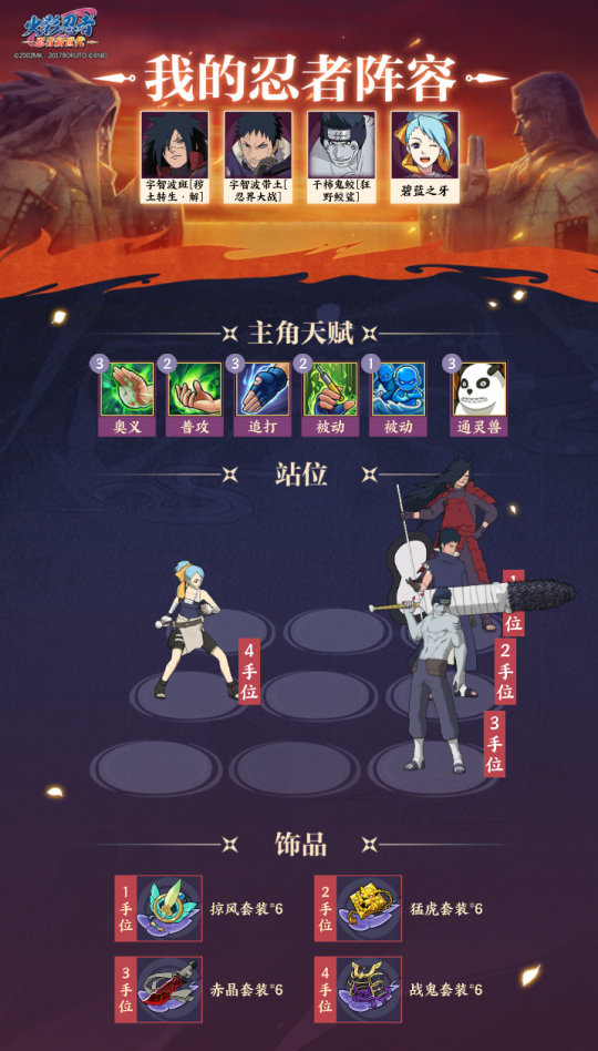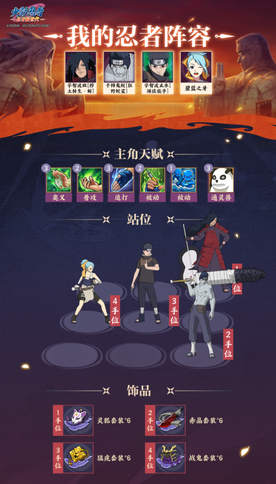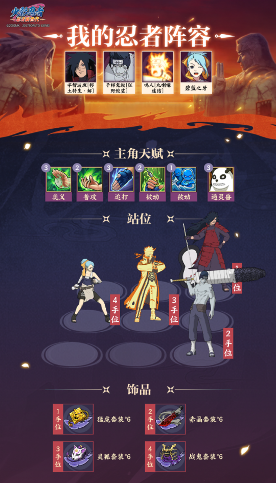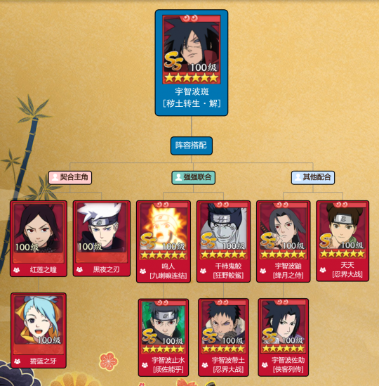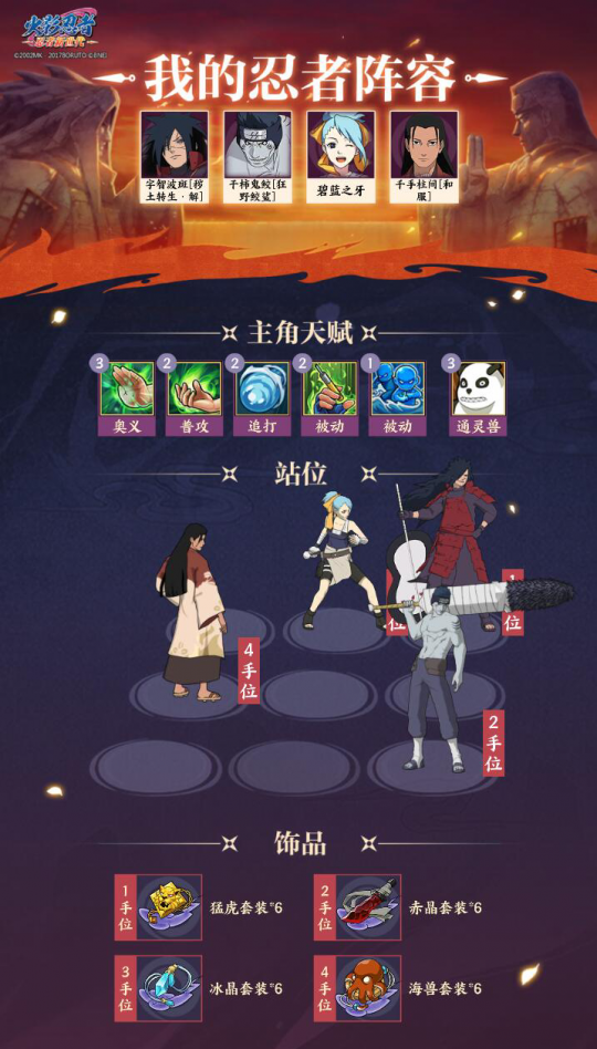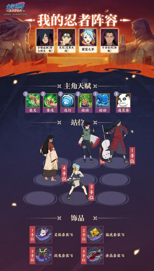 4、千手柱间[和服]提供火之意志”增益和查克拉,以及增加对方的奥义查克拉消耗。阵容六: