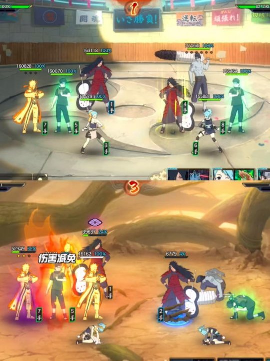 1、我方斑使用奥义,造成伤害,追打被对方鸣人中断;