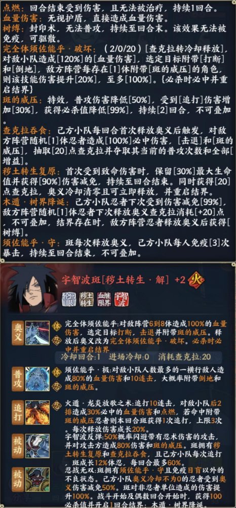 Tip:能概率闪避掉纯忍和体忍伤害,在当前环境中触发的频次会非常高,然后会造成斑的威压。其次查克拉吞食能夺取对方的普攻次数和全部增益以及查克拉。秽土转生复原则是提高了斑的生存和操作上限。然后可以通过小队来养成自身的体忍,配合奥义或追打,能造成更高的伤害。