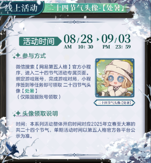 处暑线上活动将于8月14日10时30分至8月20日23时59分在【网易第五人格】官方小程序二十四节气活动专属页面内开展,访客们在完成相应活动任务后即可领取二十四节气头像-【处暑】。头像里,法罗女士”已经率先换回秋日衣着,身后的绿意已经渐趋呈现金黄之色,夏末初秋的天然渐变色是大自然给予的馈赠,请尽情享受吧!