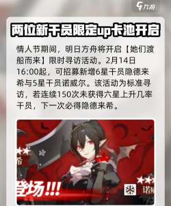 ”她们渡船而来”是本次的限时寻访活动,2.14-2.28可参与,有两位全新的up干员,分别是六星的近卫隐德来希,以及五星的诺威尔,还有五星的温米,新干员上线时,信赖的获取提高,两位全新干员会在2.27日之后加入到常驻卡池里面。