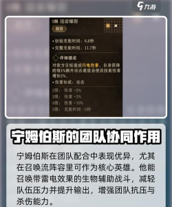 最后,在团队配合方面,宁姆伯斯也展现了强大的协同作用。例如,在召唤流阵容中,他可以作为核心英雄,通过召唤拥有雷电效果的召唤物辅助战斗,大幅降低队伍承受的压力,同时提升整体输出能力,这会为这个团队带来更好的抗压能力,并提高了团队的杀伤力效果。