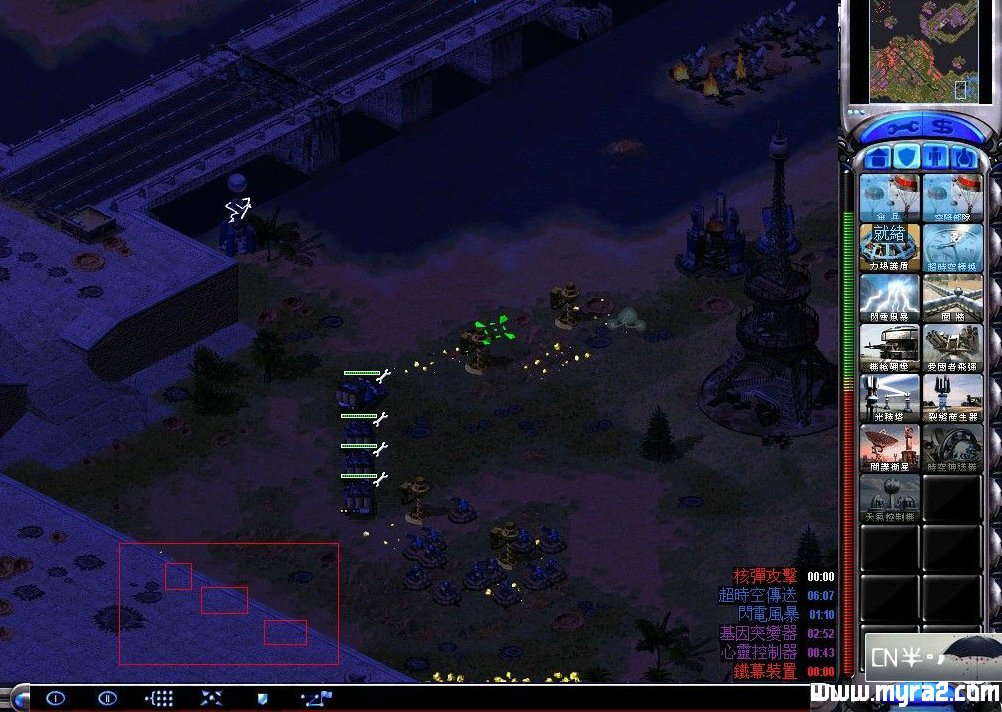 这关光棱塔改的BT了,不是是属于我方的,只能拥有一段时间。基地车要靠磁电坦克,建议开始时先存档,左边的天启是重点,要移到中间那块地。有一块地一过去就会出现很多箱子,箱子不定,爆炸居多。