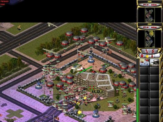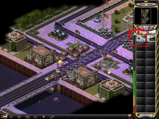 继续进攻,动员兵到前面两个建筑里,然后杀进前面的盟军基地,这时工程师进入科技机场,动员兵扫掉盟军的兵和爱国者,派几个动员兵打死红箭头那的大兵。如下图
