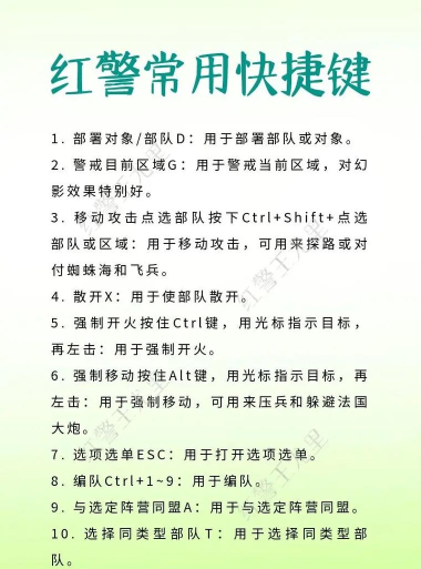 强制攻击,很多玩家都知道的吧。当你的坦克被恐怖机器人钻了,又没有机会及时维修,使用这个操作自灭一个坦克可以把恐怖机器人一同灭掉,阻止进一步的伤害。水里的东西被潜水单位攻击时,亦可用此键让射程足够的武器强制攻击发出攻击的水域,让那单位浮起来,进而消灭它们。9