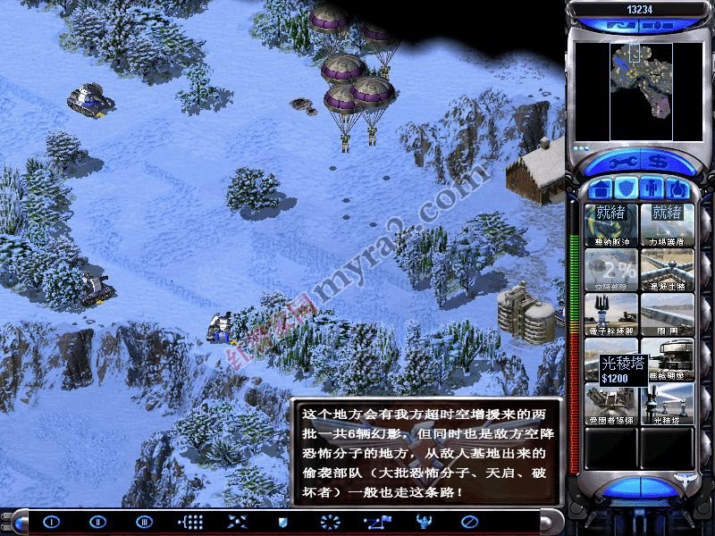 天启马上过来弄开这个铁网。派一个工程师来占领油井。然后天启就到这里待命了。等下会有一群坦克过来。你要利用这里的地势优势用一个秒杀他们。)