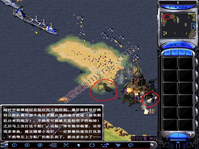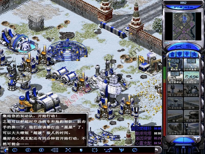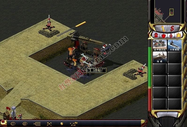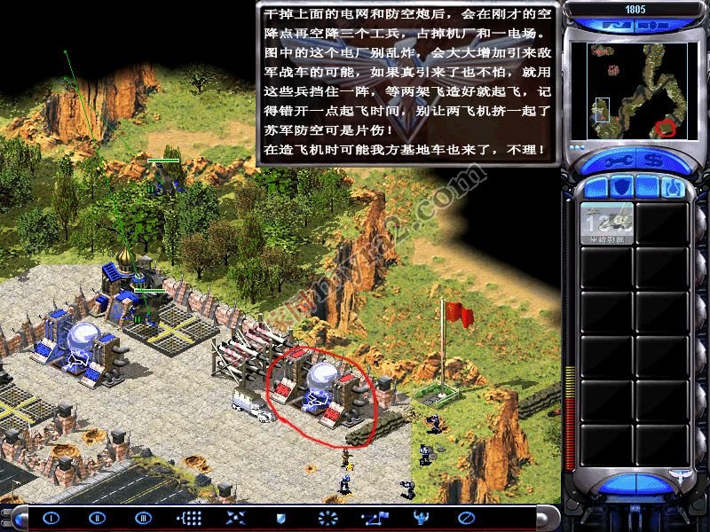 好像我是弄完刚才的所有步骤,才没有游戏结束。才有空派一个天启来这里弄掉铁网。钱只够你暂时生产2个工程师了。先占领一个油井。然后出一个碉堡,进驻5个小兵。敌人的下一波攻击油井这里会有几个光陵坦克。