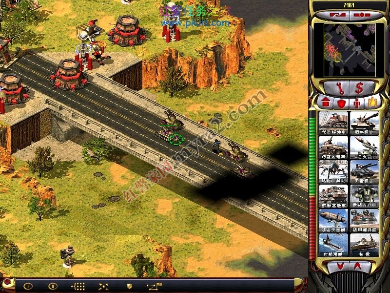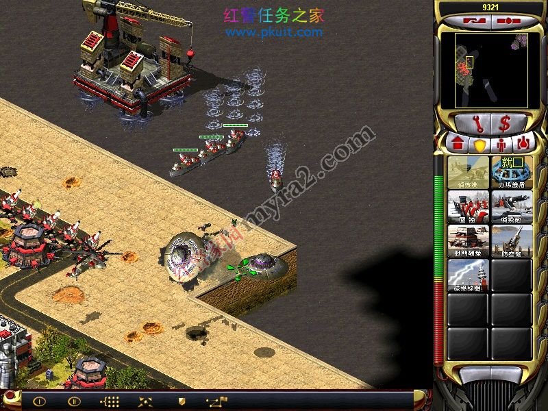 等有点小钱了,用运兵船运一个基地车来这个位置发展。不要走桥上,太多兵力及有其他防御。然后小心清理掉尤里的防御,占领他的战车工厂和心灵探测,可以出磁电坦克。这个拆建筑还蛮快的。当然,你也可以直接我的下一步