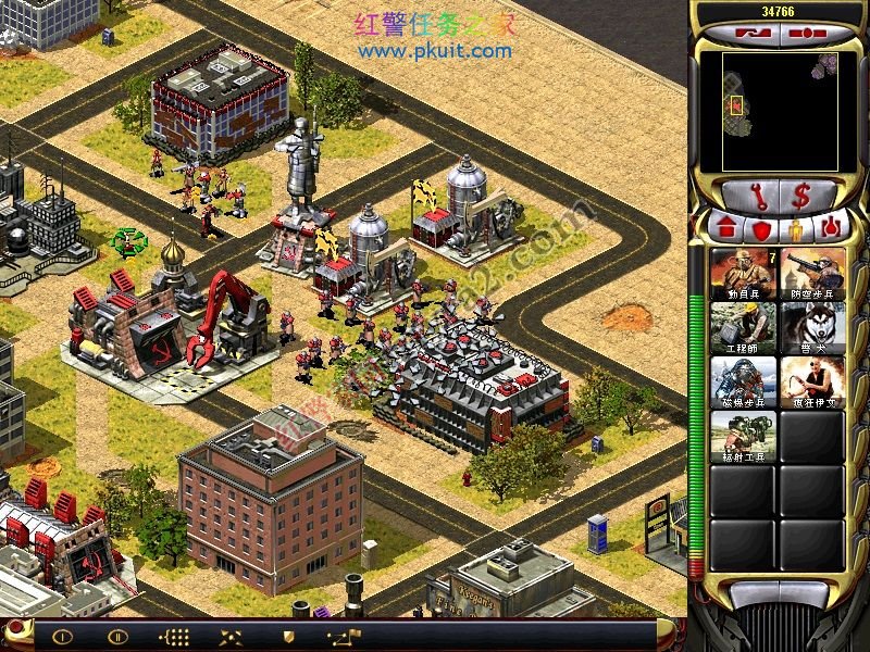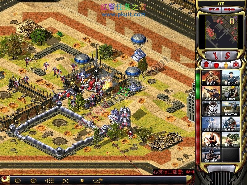 然后用帅哥去攻击小兵,小兵会错乱,然后自相残杀。由于开始的时候没有给坦克,给的兵也不多,所以可以错乱一个落单的小兵,他会去打哨戒炮,而哨戒炮不会打他。自己到游戏里揣摩一下,记住,要错乱落单的小兵。如果成堆的兵,他们会优先兵与兵之间自相残杀,最后才是打建筑。