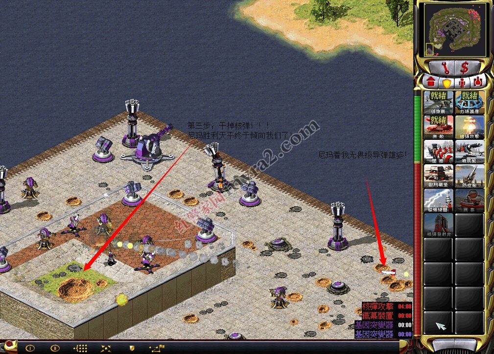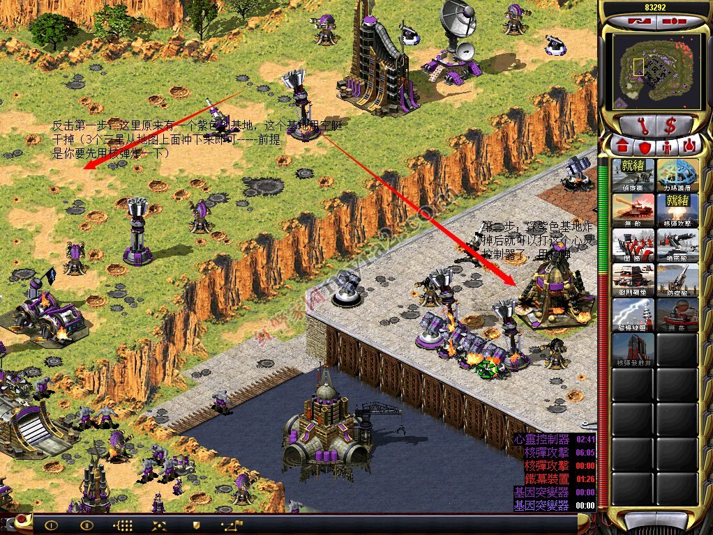 ②炸完那个紫色基地,敌军的核弹和心灵控制器如果再被炸就不能重建了,所以就是反击的时候了!所以第二步就是炸核弹。用情况1里面核弹附近的空艇直接炸掉,这次不用小心别的,炸掉就是。然后炸心灵控制器,附上炸心灵控制器和核弹的图:
