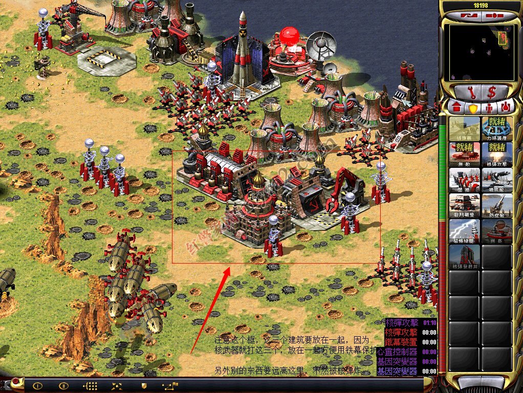 ①基地展开后要马上建出所有建筑,要注意的是把战车工厂、实验室、基地车紧密放在一起,其余的建筑有多远就建多远(核弹只炸这三个,用铁幕一次性全罩住。)快出铁幕、核弹(注意顺序)要建在远一点的海边,并且铁幕要靠里,核电厂建在核弹靠里一点的地方(防止被吸电)附上示例图:(看图中说明)