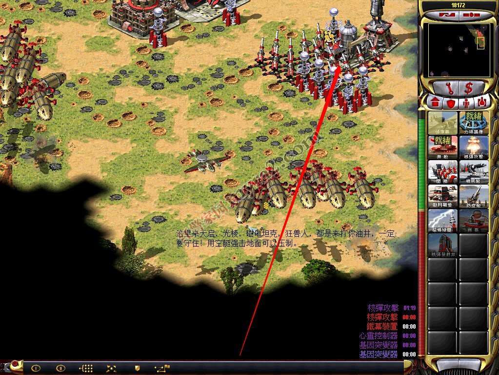 这个阶段比较辛苦,你无法建造主动攻击武器,你的钱也在快速减少。①你要尽量多建筑防空炮,放在核武以及油井旁边。