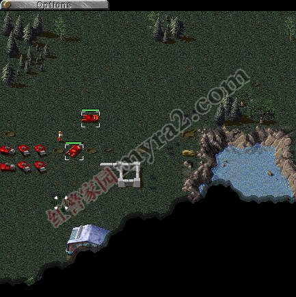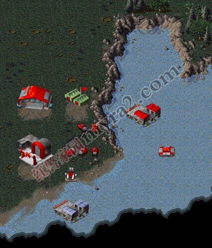 与此同时,左上角开始建造船坞造3-4艘驱逐舰,2艘运输船,搭载4磁暴坦克1重型坦克,和2工兵1间谍准备登陆