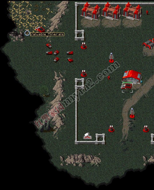 控制左上角后,修理坦克,留守2部磁暴守家圈地到矿井附近开2矿,全力防守运营