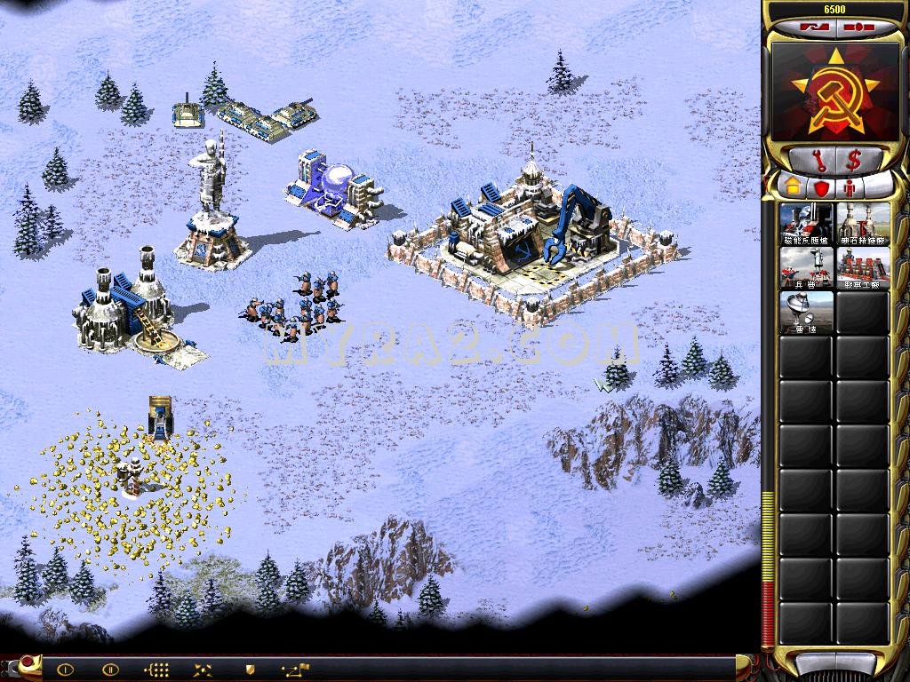 有些地图,基地车的初始位置与矿石地是有一定距离的,我们在将基地车展开以后,首先建造发电厂,发电厂建在主本与矿石地连线上能建的最远位置,然后建兵营,建在发电厂与矿石地连线上能建的最远位置,最后建矿场,这时候矿场就能建得贴近矿石地了。