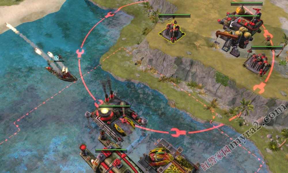 例如在无限岛,基于起重机有够大的维修范围,我们可以考虑把起重机放在下图这两个位置,这样就可以全方位的发挥起重机的维修效率。另外把无畏放在这个地方的话,不仅可以拆到对方的矿,还能支援中路的正面战场,这种打法的收益也是比较可观的。