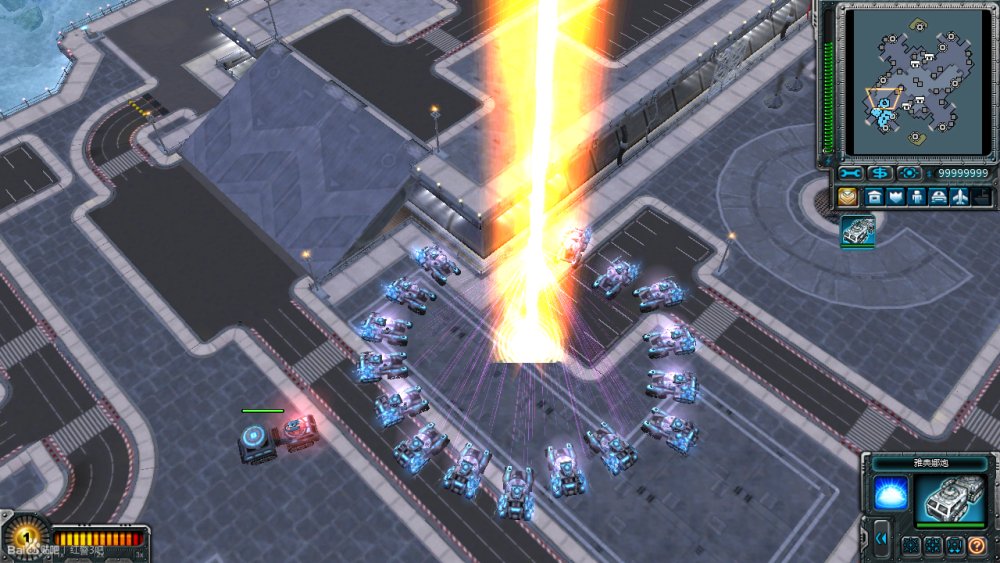 《红色警戒3》中雅典娜神炮和幻影坦克,比如把4辆幻影坦克攻击对方的兵营,然后用雅典娜神炮攻击兵营会发生幻影坦克的光谱炮升高和折射,有个折射点伤害最高,在折射点会伤害到对方的其他主要工程,相当于移动版的光谱塔,效果如下图: