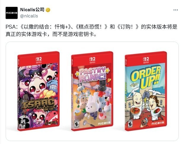 10月28日,Nicalis正式官宣《以撒的结合:忏悔+》以及旗下另一款游戏《甜点恐慌》将于2026年第一季度发售,而《Order Up》计划于2026年第二季度发布。关于是否是陷入争议的任天堂钥匙卡,Nicalis表示旗下三款即将登陆任天堂Swtich2的游戏都将使用传统游戏卡而并非钥匙卡。