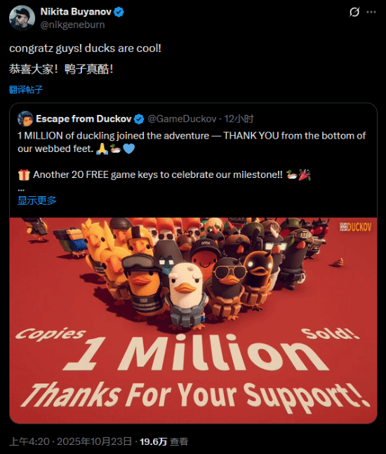 值得注意的是,此前官方已经宣布本作销量突破100万,而且《逃离塔科夫》的游戏总监也发文庆祝,表示:恭喜大家!鸭子真酷。