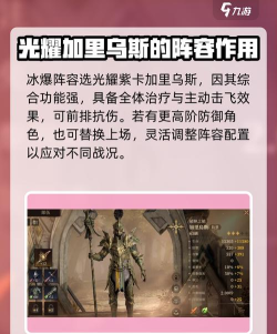 在冰爆阵容中选择带光耀属性的紫卡加里乌斯,主要是因为他的综合功能性较强,不仅有全体治疗,还有主动选择目标击飞的效果,可以放在前排抗伤。如果玩家有更加高级的防御角色,也可以替换上场。