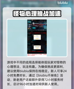 不同的结局选择是体现了玩家的对于怪物的心理想法的,玩起来还是蛮有意思的。想要挑战的更顺利,用biubiu稳定在线状况吧。现在的新人用可是有24小时免费时间呢,还有【biubiu不掉线】能用,可给新老用户换来额外的72小时服务时间,综合下来就是96小时加速时间给新人用了。
