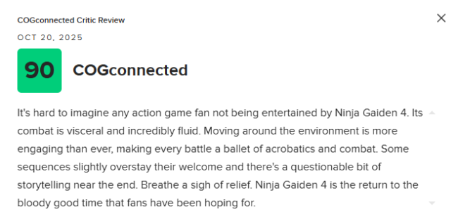 由Xbox Game Studios发行,白金工作室和Team NINJA联合制作的动作冒险游戏《忍者龙剑传4》现已正式发售。该作的媒体评分也已解禁,目前Xbox版M站均分为83分,共收录38家媒体。