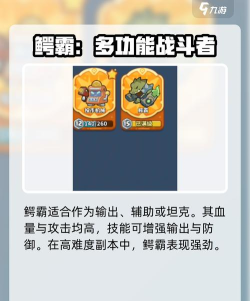 第二个推荐的角色是鳄霸。这位既可以当做输出也可以当做辅助或者坦克。它本身的血量和攻击都很高,自身的技能也有着增强输出和防御的能力,在一些对于强度要求比较高的副本中,鳄霸会有着很强的表现。