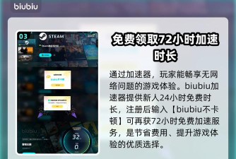 通过加速器,玩家可以更加顺畅地进行游戏,而不必担心网络问题影响游戏体验。此外,biubiu加速器还提供了免费24h时长的新人福利,玩家在注册后即可享受一定时间的免费加速服务,输入【biubiu不卡顿】再获得72小时,这对于那些不愿意花费额外费用的玩家来说,是一个非常划算的选择。