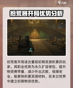 如果小伙伴们对于初期资源的积累方面比较看重,那么可以选择拾荒客开局,能快速的在前期建立起优势,毕竟该职业的优势之一就是扩容,可以将背包的容量扩大,而且是永久的,毕竟在末日世界需要自行日常所需的物资,每一次只能装背包上限的那么多东西,但是该职业直接解决了这方面的问题,外出寻找物资一次可以带回来更多,就避免了多次外出,相对来说也更加安全,资源材料积累的速度也可以比别人快,初期的物资优势就建立起来了。