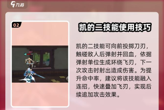 之后是他的二技能,这二技能的效果为向前放投掷出一把刀刃,该刀刃会在接触到敌人之后会进行弹射攻击,每次弹射攻击都会回复自身一定的血量,此外还会根据弹射的单位数量,生成新的飞刃,这飞刃会环绕在凯的周围,之后会随着下一次攻击全部射出对敌人造成伤害。这二技能对技能命中有一定要求,建议大家给该技能加入到连招中来使用,这样技能的命中率可以大幅度提升,大家就可以快速的叠出后续的飞刃,然后利用飞刃进行追加攻击了,这就是他的二技能用法了。