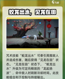 咒术技能“蛟龙出水”,将周围的敌人牵引到自己身边并造成伤害,释放后她获得“见龙在田”状态,该状态之下,”蛟龙出水”升级为“龙起扬波”,可以通过输入方向决定该技能的释放方向,在命中敌人时会刷新该技能的冷却时间。