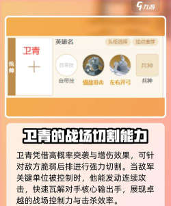 卫青的自带技能是开疆拓土,这是一个被动技能,发动几率为100%,这一招可以提升角色自身普通攻击造成的伤害,回合内每发动1次普攻或追击技能,伤害就会变高,效果还会不断地叠加直到本回合结束,此外,这个技能还能产生溅射,普通攻击会对目标附近1名敌军单位造成一定比例的伤害。每回合行动时英雄会进入到锁敌状态,对攻击距离内处于控制状态的英雄有较高几率进行一次突袭,单回合最多能进行3次突袭。如果你连续摸到了好几张卫青,那么还能将其进行拆解,接着就能得到淬毒飞刃这个技能卡,这招会在普攻后生效,完成进攻之后,会使敌人进入到沉默状态。