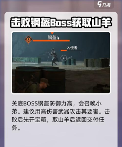 在关底的时候我们会遇到BOSS钢盔,这个敌人会时不时召唤小弟过来,他本身的防御力比较高,玩家们尽量使用高伤害的武器对准其要害进行攻击,在将其击败后我们先打开宝箱,然后拿到山羊后回去交付任务。
