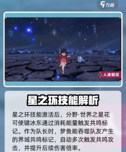 星之环技能激活后,”分野·世界之星“花可以让她消耗键冰东鞥能触发共鸣标记,她作为队长,梦鱼可以作为界域共鸣标记,将队友产生的共鸣标记都吞噬,自动触发多次共鸣攻击,触发标记造成伤害时,后续共鸣攻击的伤害倍率也得到提升。
