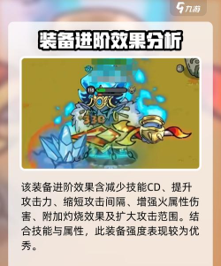 技能效果看完后,接下来就到进阶效果了,该装备的进阶效果一共有六个,这六个效果分别为减少技能cd,增加攻击力、减少攻击间隔,增减火属性伤害、给到灼烧效果和攻击范围增大,这就是该装备的全部进阶效果了,结合技能和属性来看的话,这装备强度是不错的。
