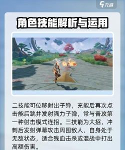 之后要看的是他的二技能,该技能发动之后他会向前进行一个短距离的位移,之后会向指定方向射出大量的子弹,在这期间他会进行充能,等到充能结束之后再次点击该技能,可以往后跳一下然后射出一发威力强大的子弹,该技能通常是用来配合普攻技能的第一种射击模式进行连招输出的,在战斗中可以在快速射击和敌人拉开身位后,然后利用该技能打一套输出。