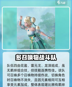 在这三个队伍后,有羁绊组合的队伍也就都介绍完了,接下来要带大家看的是没有羁绊组合技的队伍,这类队伍主要看的就是角色的技能了,看看技能之间的连携性怎么样。而看技能连携的话,花盈、雷元戈、龙溟这三位角色搭配出的队伍就不错,他们三个搭配出的队伍可以召唤多个召唤物,利用召唤物进行战斗,期间切换人物召唤物还不会消失,此外因为元素相同的原因,他们之间的元素加成效果还都可以互吃,这么来看的话,这队伍虽说没有羁绊组合技,也胜似有羁绊组合技了。