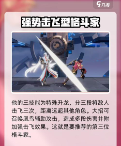 在这之后是他的三技能,他的三技能就是一个特升龙技能,不过区别于其他角色的升龙技能,他的升龙拥有三段,可以将敌人击飞三次,这击飞的距离要远超其他角色;最后是他的大招,他的大招发动之后,他会召唤凰鸟辅助攻击,会对对手造成多段伤害并且给到强击飞效果,这就是第三位要给大家推荐的格斗家了。