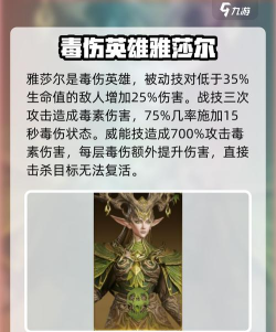 雅莎尔是位毒伤英雄,她的被动技可以让技能对生命值低于35%以下的敌人进行攻击时,增加25%的伤害;她的战技会对一个敌人进行三次攻击,每次都会造成毒素伤害并有75%几率施加一层毒伤状态15秒,毒伤会每五秒对敌人造成一定比例的派生伤害;她的威能技会对范围内的敌人造成700%攻击的毒素伤害,目标身上每有一层毒伤,就能额外再进行一定的伤害,被该技能直接击杀的敌人无法复活。
