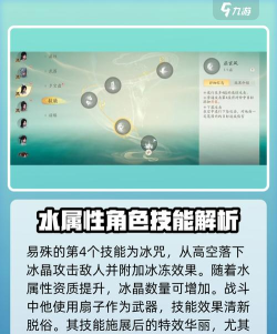 第4个技能是冰咒,从高空中砸下冰晶,对敌人造成伤害并附加冰冻效果,后续通过提升水属性资质,冰晶的数量还能提升,这也是水属性角色的普遍特点。在战斗过程中,易殊使用的武器是扇子,配合上自身的技能,效果非常清新脱俗,这也是他赢得众多玩家关注的原因。施展之后的技能特效也很华丽,尤其是4种不同的阵型,特效都有自身的特点。