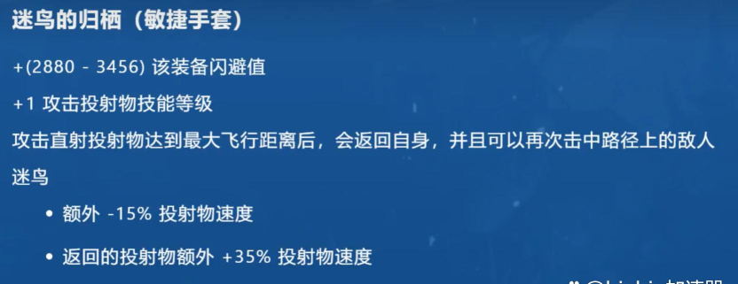 迷鸟的归栖(敏捷手套):投射物返回机制+30%伤害提升,适配直射流派。