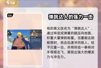 二技能“弹簧跳跃”,他的双腿变成弹簧下蹲,之后快速起跳用弹簧双腿践踏敌人,在跳跃时按下普攻可以打断额外的跳跃。奥义“弹簧跳人”,将变成弹簧的腿压向地面,向脚步储存大量的弹簧位能,在动能达到极值会极速冲撞敌人,最后使用终结一拳将敌人重重击飞。