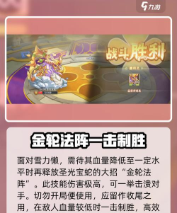就比如圣光宝蛇和永夜神子这两只精灵,大家需要携带这两只精灵去打,打的时候需要让圣光宝蛇先单独上场去面对第一波精灵,在面对这一波精灵的时候,大家需要使用威压加守住加威压加大招的连招。